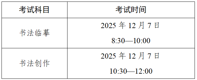 广东省2026年普通高校招生书法类专业省统考将于2025年12月7日进行,相关科目考试时间如下: